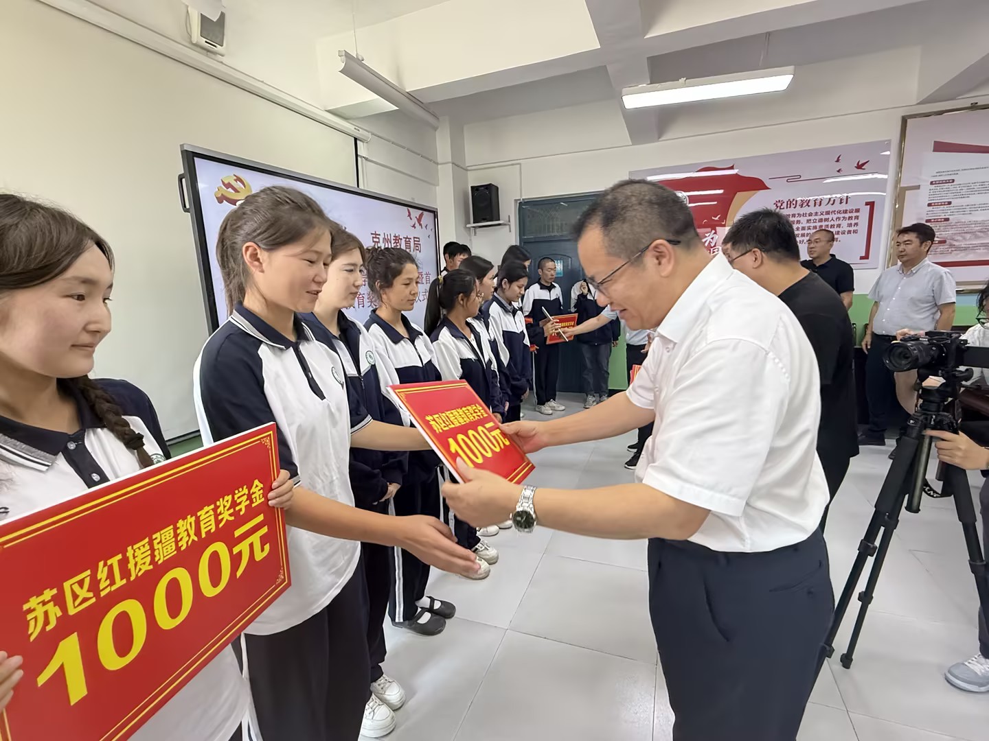 同时,我校与克州教育局签约设立“苏区红”援疆教育奖学金,肖笃森在签约仪式上介绍了我校红色文化育人的办学特色,并表示希望以奖学金的设立为契机,让赣新两地在常来常往中增进了解,在同心同行中凝聚共识。